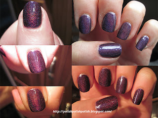 The one in the upper right corner is taken in regular daylight and shows a nice purple with a hint of shimmer. The other ones are taken in my bathroom, some with flash, some without. Here you can see a bit of the holo-effect, but not all.... I will be back with photos in the sun as soon as it wants to show itself!